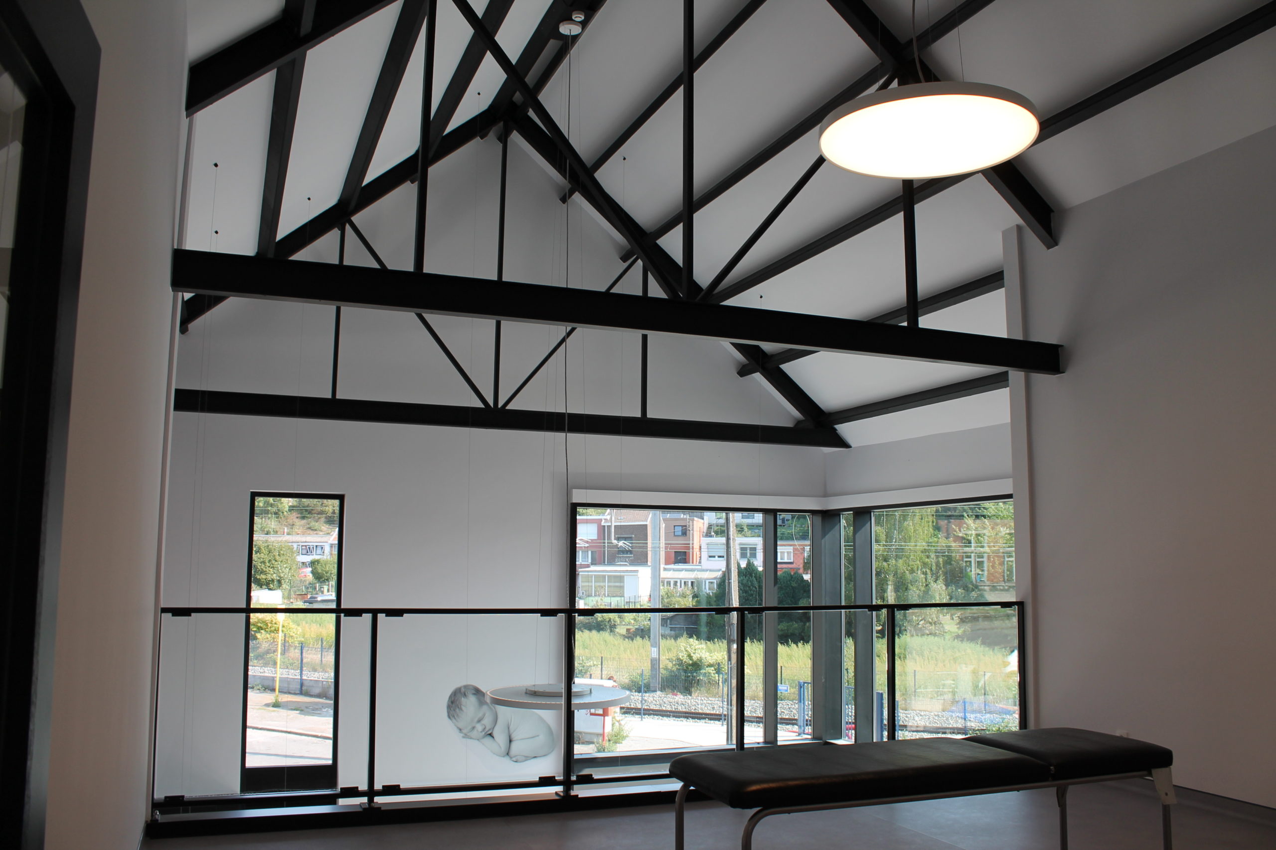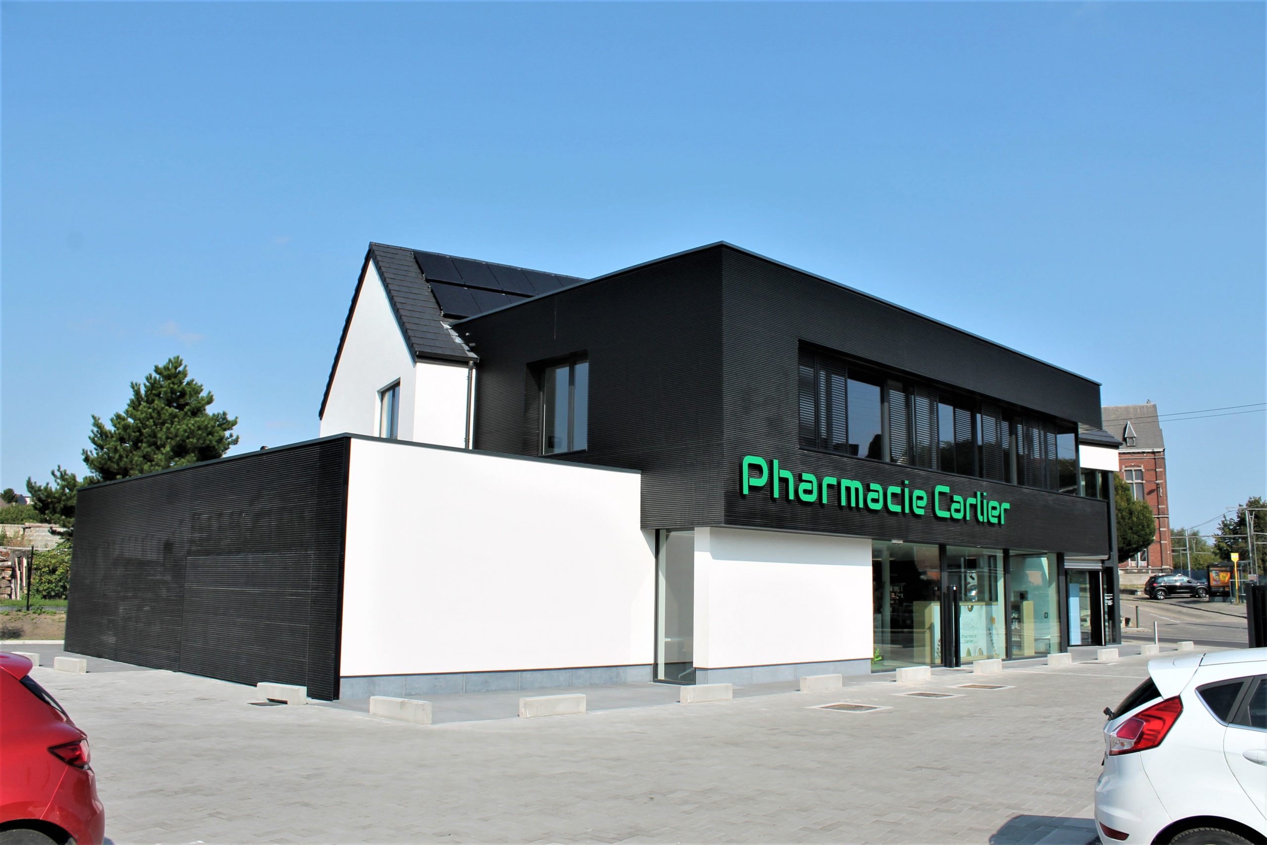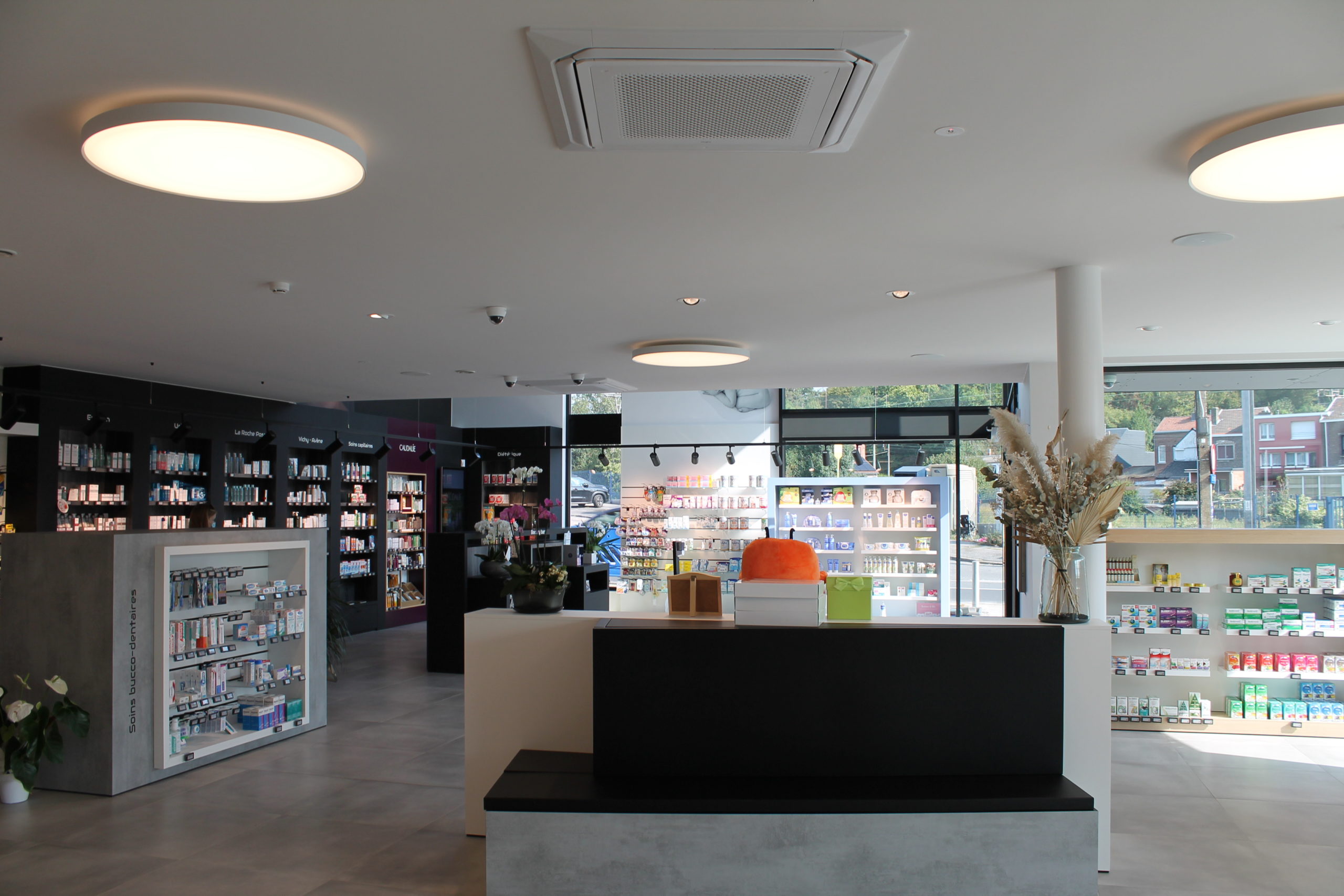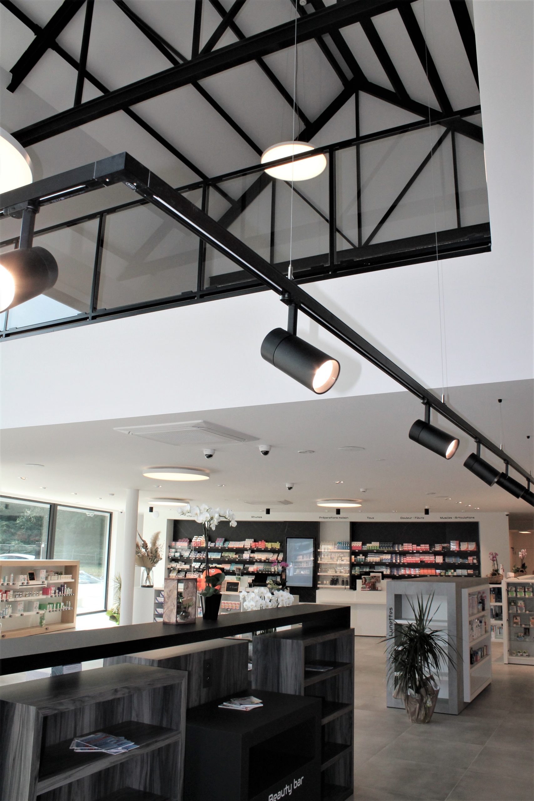 Le projet se veut lumineux et cohérent dans sa composition, permettant de mettre en évidence la pharmacie tout en apportant une harmonie sur l’ensemble de la composition. Cette mise en valeur du bâtiment se traduit également par des espaces largement vitrés sur le domaine public. Une double hauteur à rue offre une bonne visibilité, et une générosité dans l’espace intérieur. Elle crée aussi des relations avec l’espace de soin (bandagisterie) se développant en mezzanine. Les 5 cabinets médicaux de l’étage sont, eux, conçus de manière à respecter l’intimité et la confidentialité des patients : l’utilisation de pare-vues permet de gérer à la fois la division des espaces et l’ensoleillement.