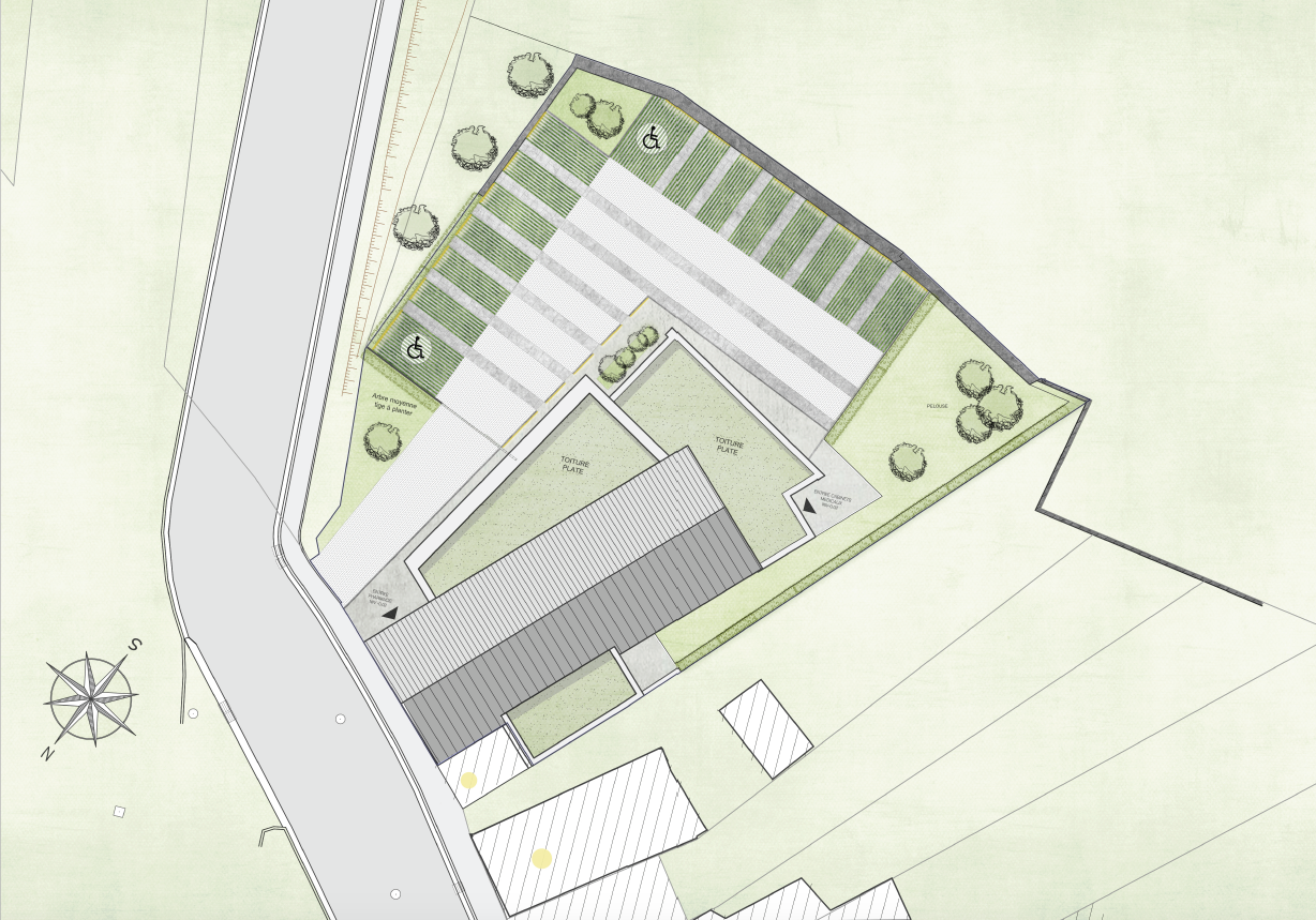 Le volume principal, avec toitures à doubles pentes, s’implante sur les traces du bâti existant. Un second volume, plus léger, repose sur le volume principal et englobe les cabinets médicaux.
