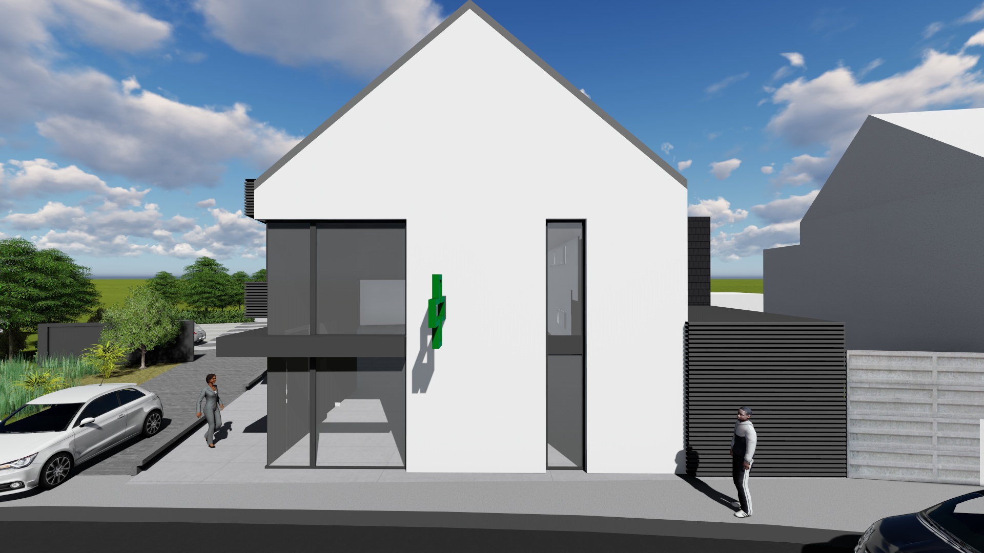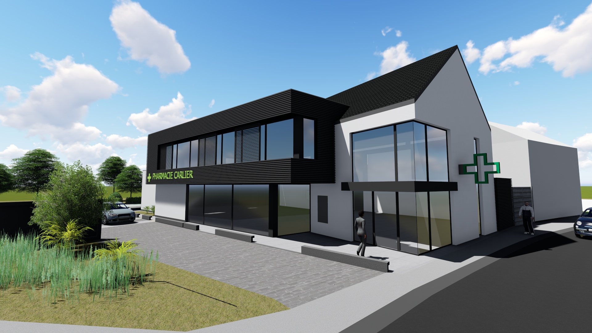 Le volume principal s’avance à rue et est réalisé en crépis blanc. Ainsi, la fonction première qu’est la pharmacie, et l’image de pureté et de fraicheur à laquelle elle réfère sont mises en avant. A ce premier volume vient s’adjoindre un second, constitué d’un bardage métallique ajouré, aux lignes horizontales, et offrant une dynamique de légèreté. Enfin, le traitement du sol et la végétation fortement présente dans l’environnement proche créent la liaison entre les espaces publics et la parcelle.
