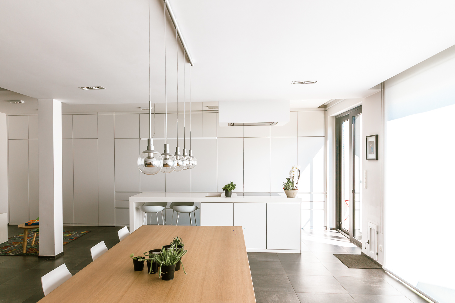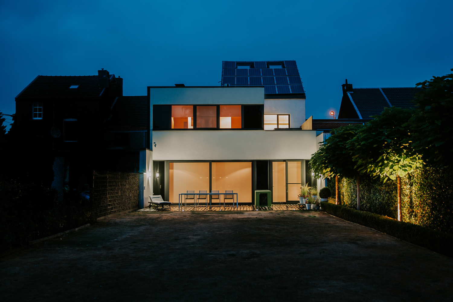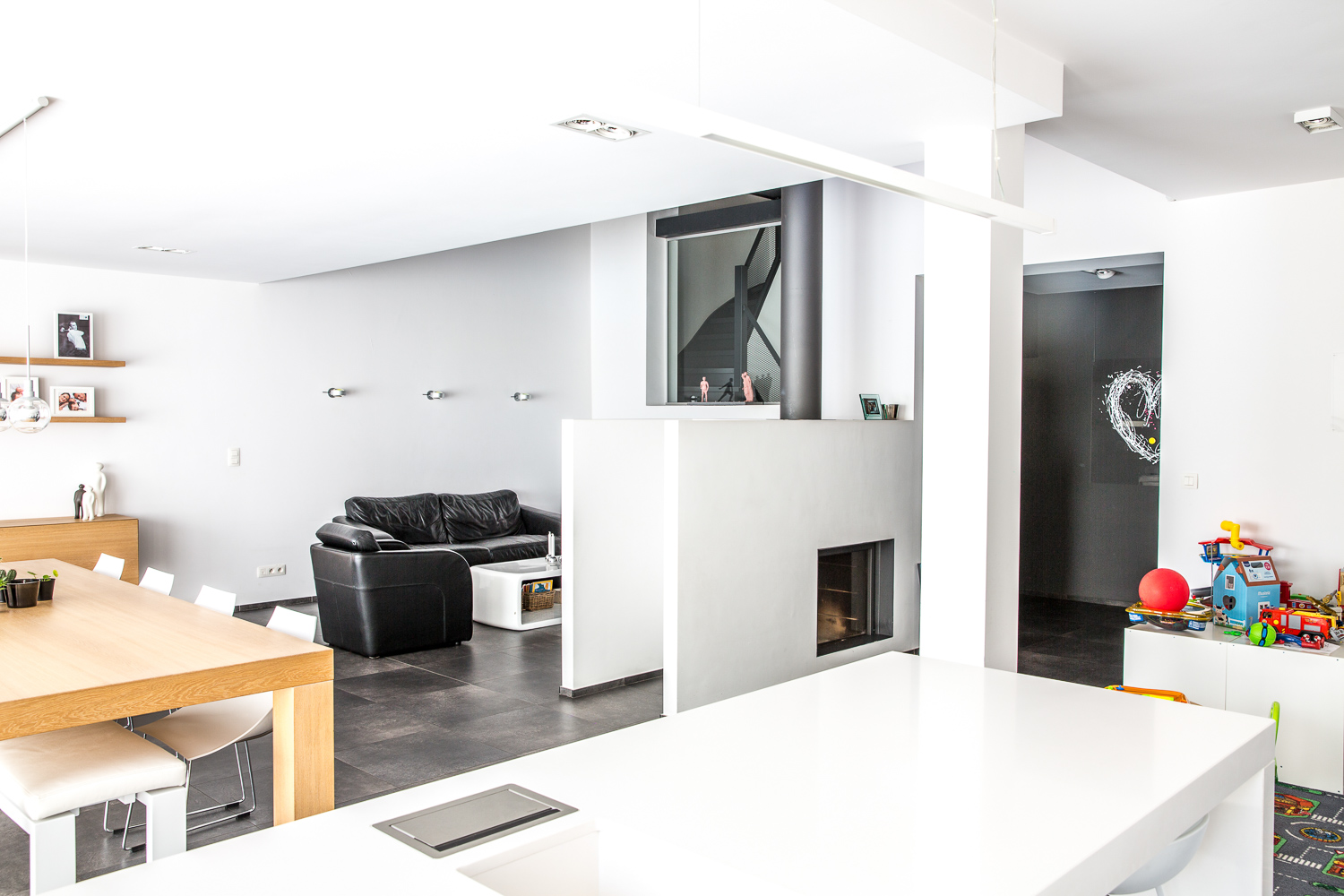 Le bâtiment initial étant très cloisonné, la volonté première a été de décompartimenter au maximum les espaces internes. Le feu ouvert devient dès lors l’élément central de la maison, et articule les espaces de jour qui gravitent autour de lui. Au rez-de-chaussée, l’ensemble – cuisine, salle à manger, séjour, et espace jeux pour les enfants – bénéficie d’une ouverture généreuse sur le jardin, et, de la sorte, d’une vue sur le terril. Les propriétaires détenant un chien, une niche a également été intégrée en façade arrière tout en gérant les notions d’étanchéité.