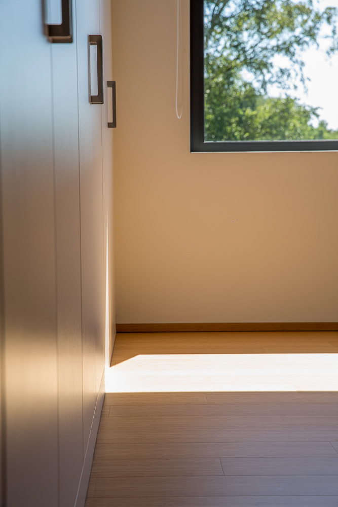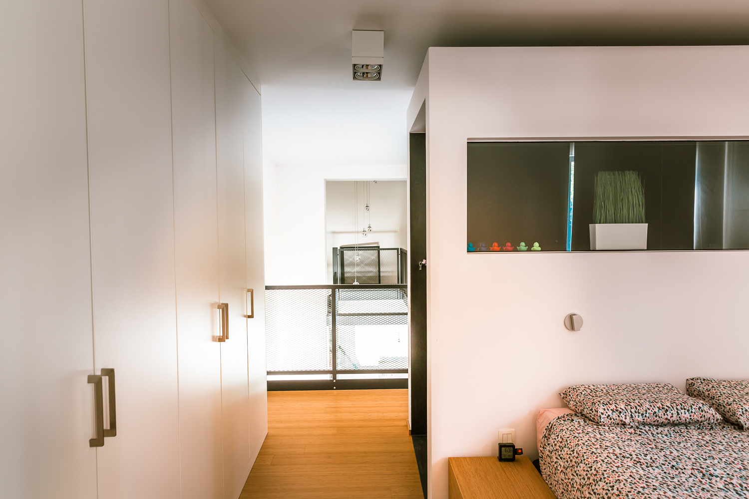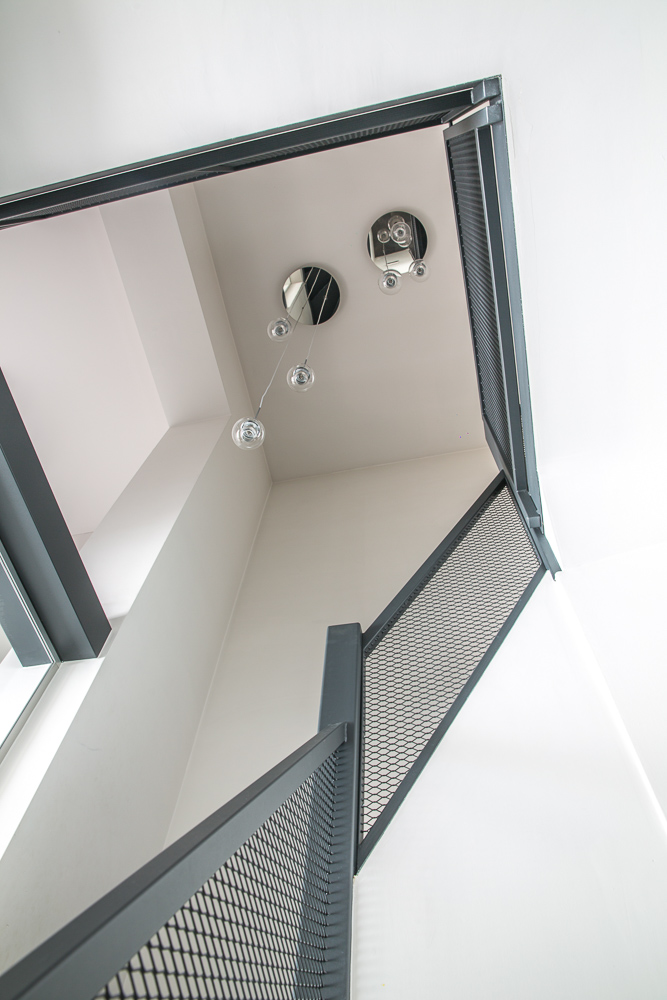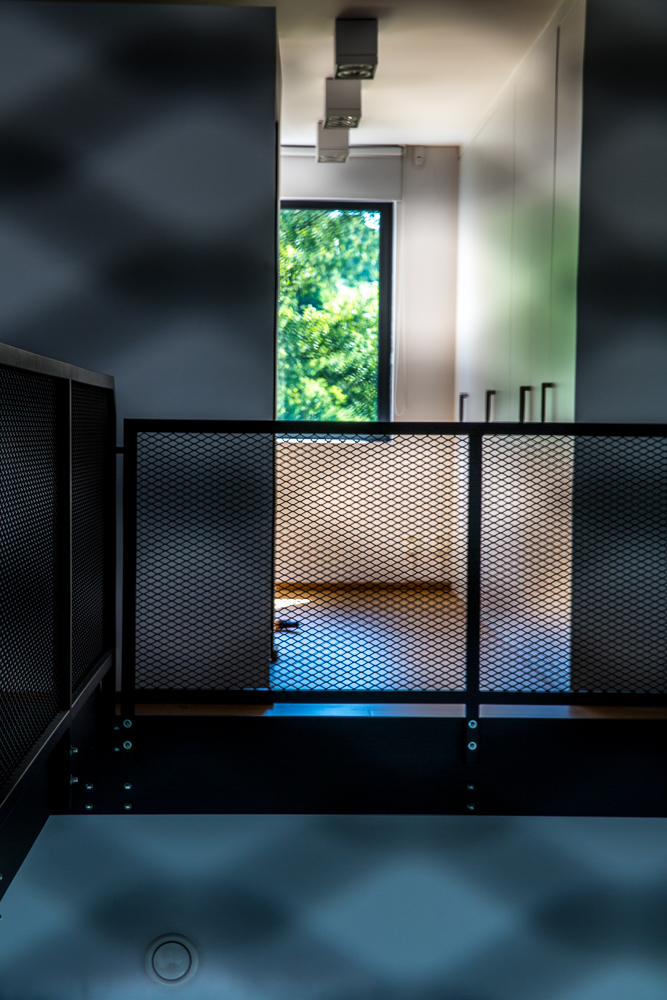 A l’étage, la jonction entre l’existant et le nouveau volume est marquée par la traversée d’une passerelle métallique. Cette passerelle permet aussi de favoriser les relations entre le rez-de-chaussée et l’étage. La chambre parentale qui s’y trouve suit le concept de décloisonnement : l’espace s’articule autour d’un bloc sanitaire et d’un dressing. La façade faisant face au lit est largement vitrée, et offre une vue généreuse sur le terril proche.