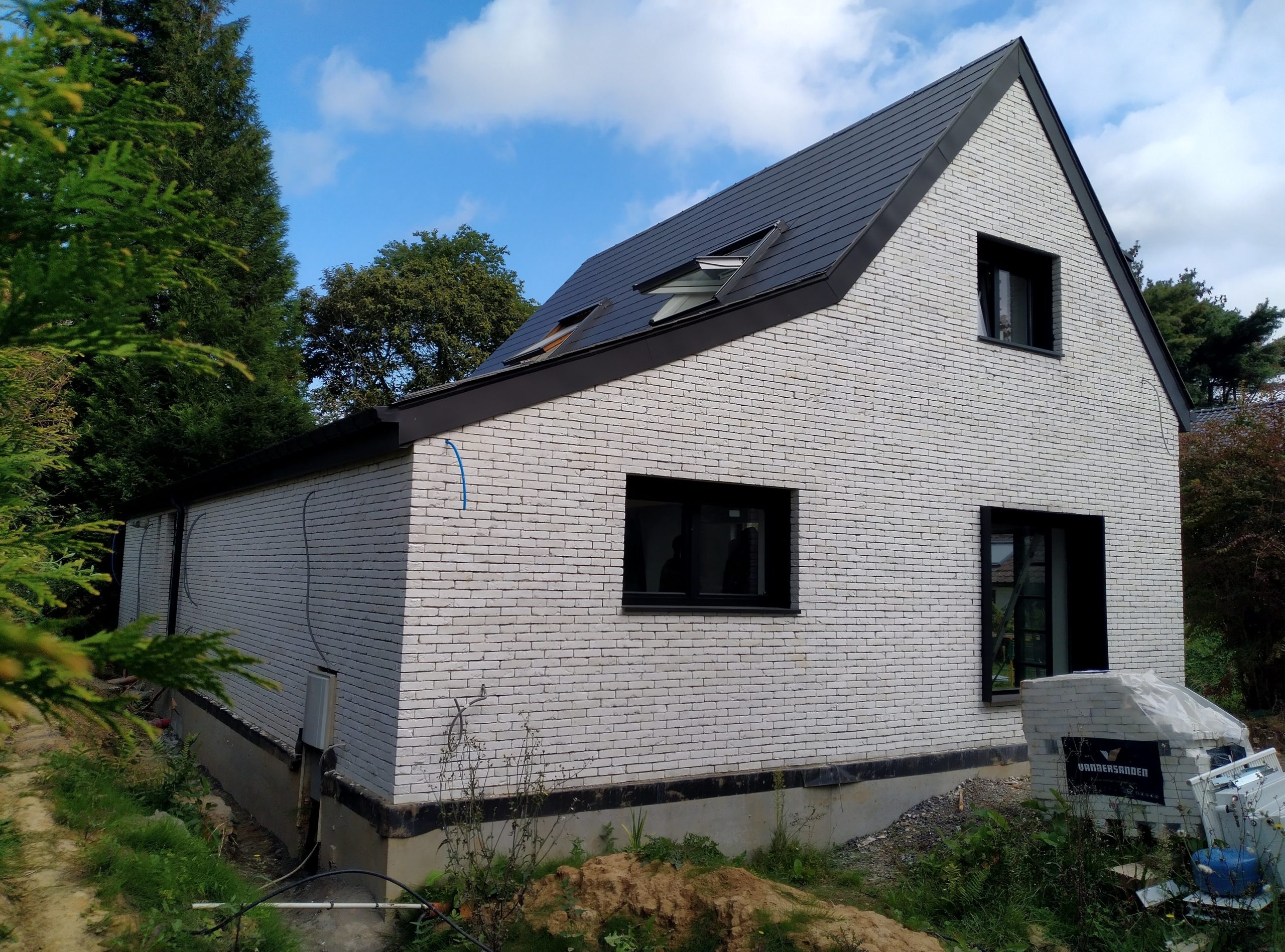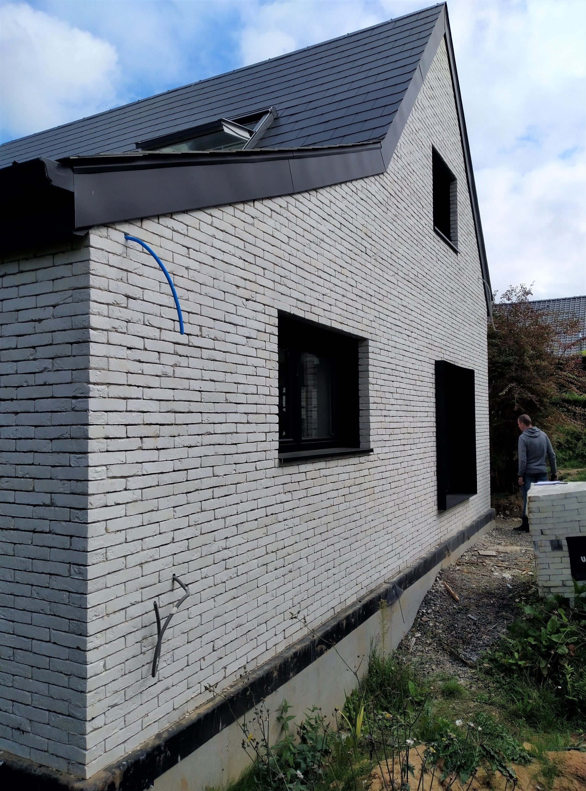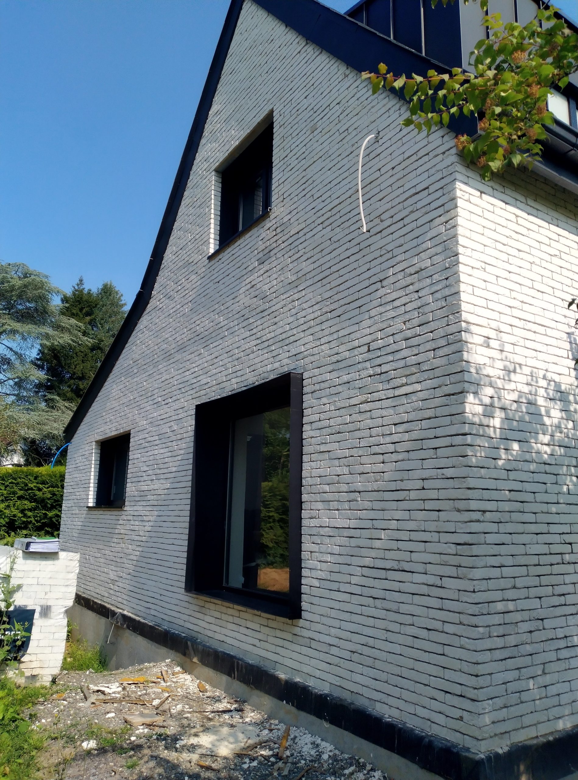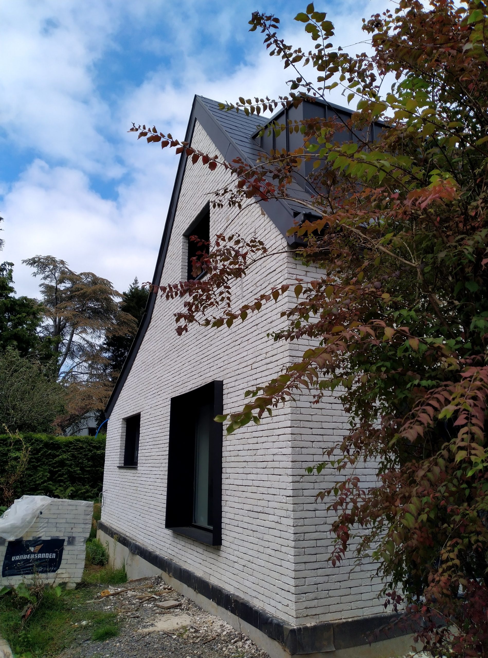 L’inscription du bâti dans la continuité du contexte existant est renforcée par le choix du matériau de façade, une brique de ton blanc. En effet, ce choix est issu d’une analyse contextuelle des habitations voisines. Il permet d’éviter la multiplication des langages en façades. L’objectif soutenu est de former un ensemble cohérent et homogène tout en ré-isolant l’ensemble des parois du bâtiment. La tuile de toiture est également remplacée par une tuile de ton noir plus sobre.