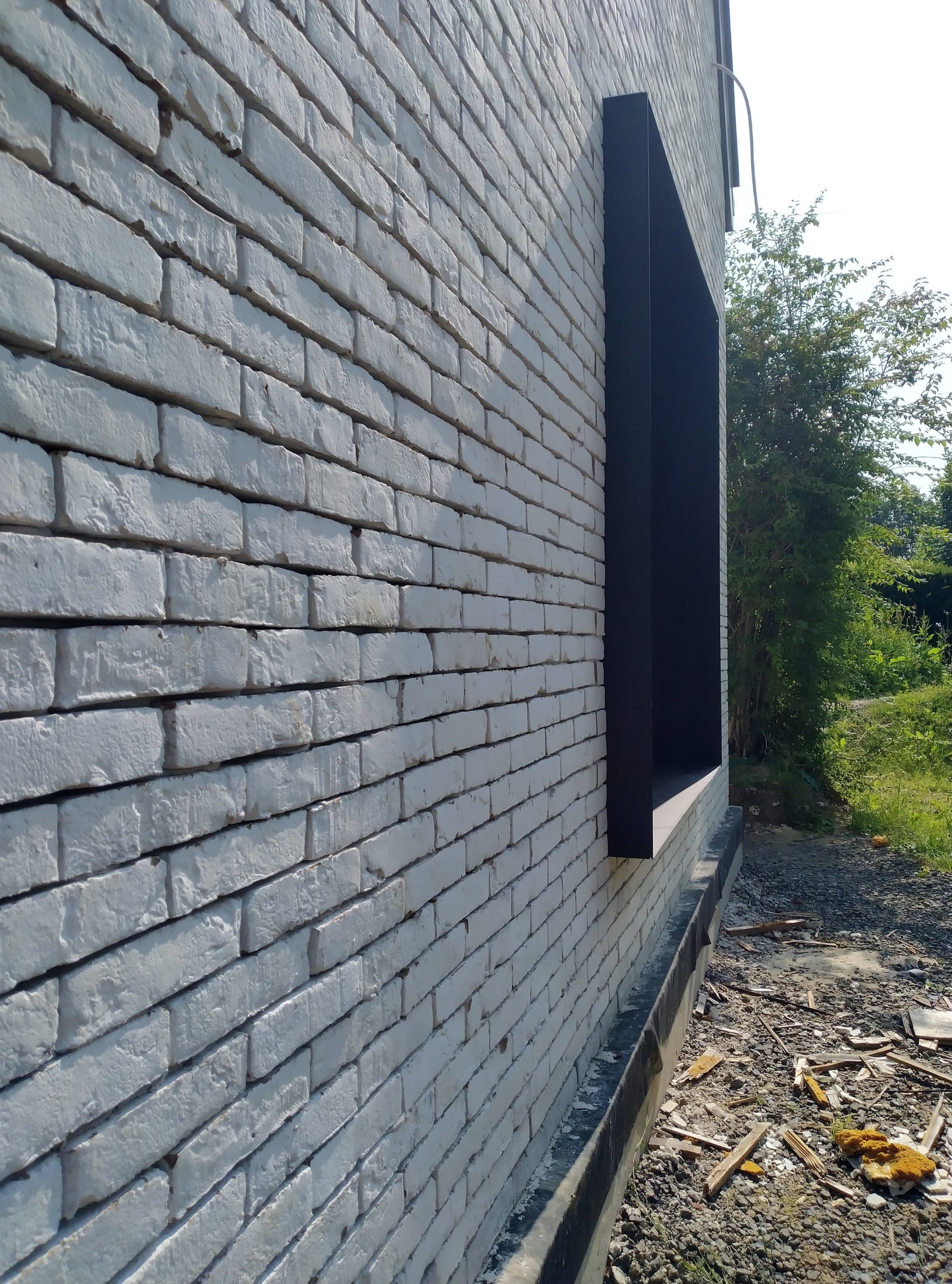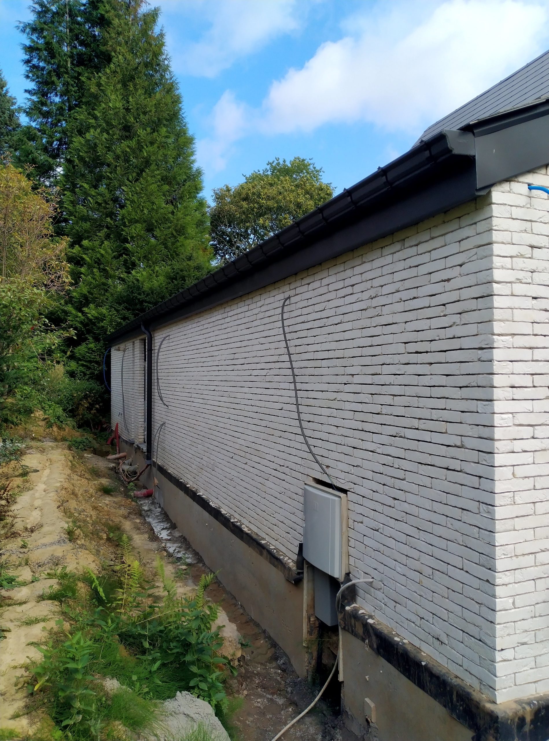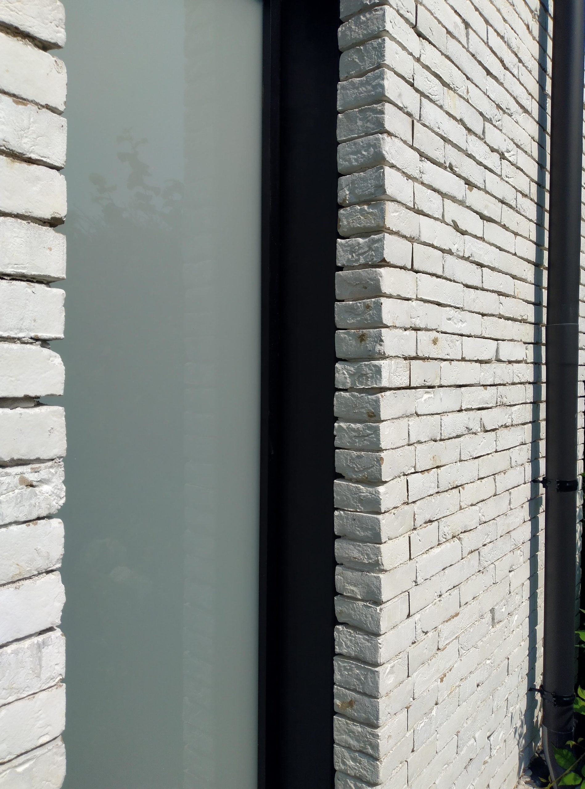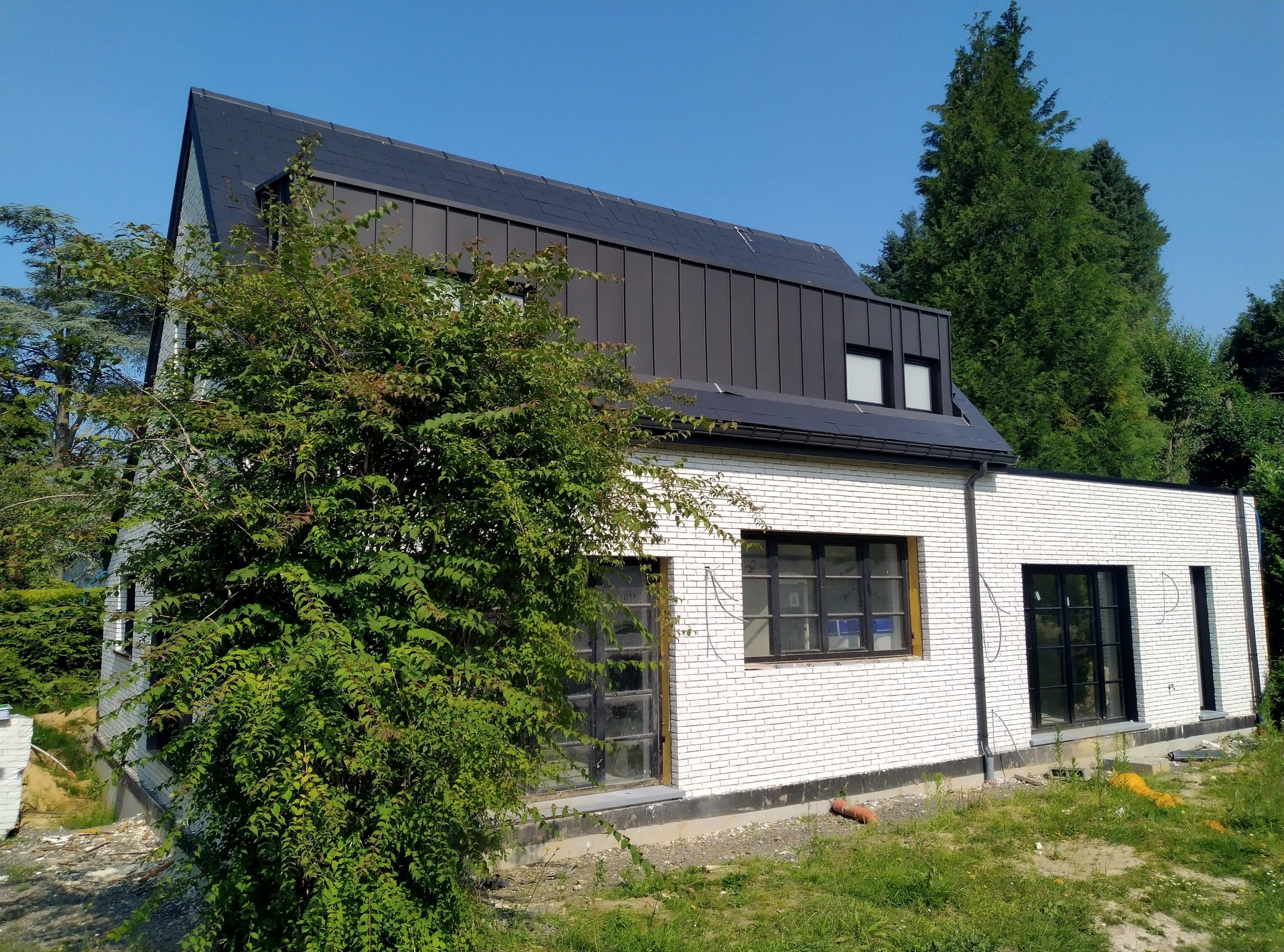 L’inscription du bâti dans la continuité du contexte existant est renforcée par le choix du matériau de façade, une brique de ton blanc. En effet, ce choix est issu d’une analyse contextuelle des habitations voisines. Il permet d’éviter la multiplication des langages en façades. L’objectif soutenu est de former un ensemble cohérent et homogène tout en ré-isolant l’ensemble des parois du bâtiment. La tuile de toiture est également remplacée par une tuile de ton noir plus sobre.