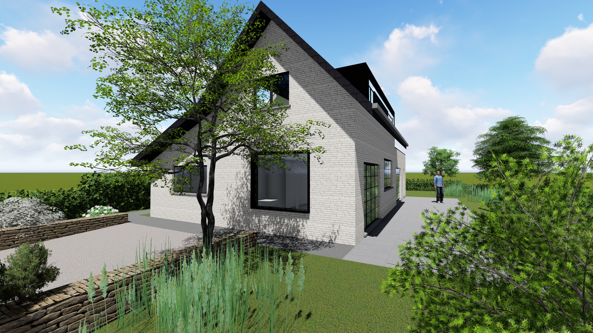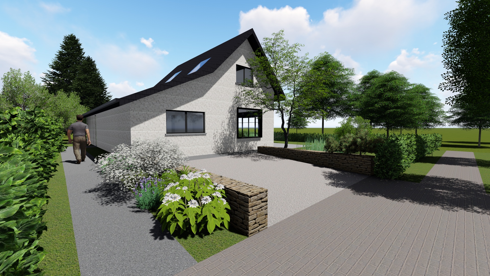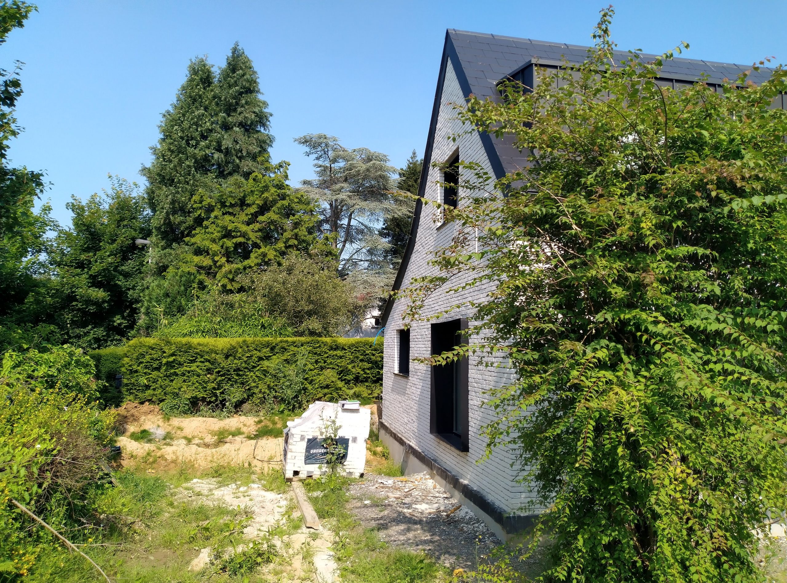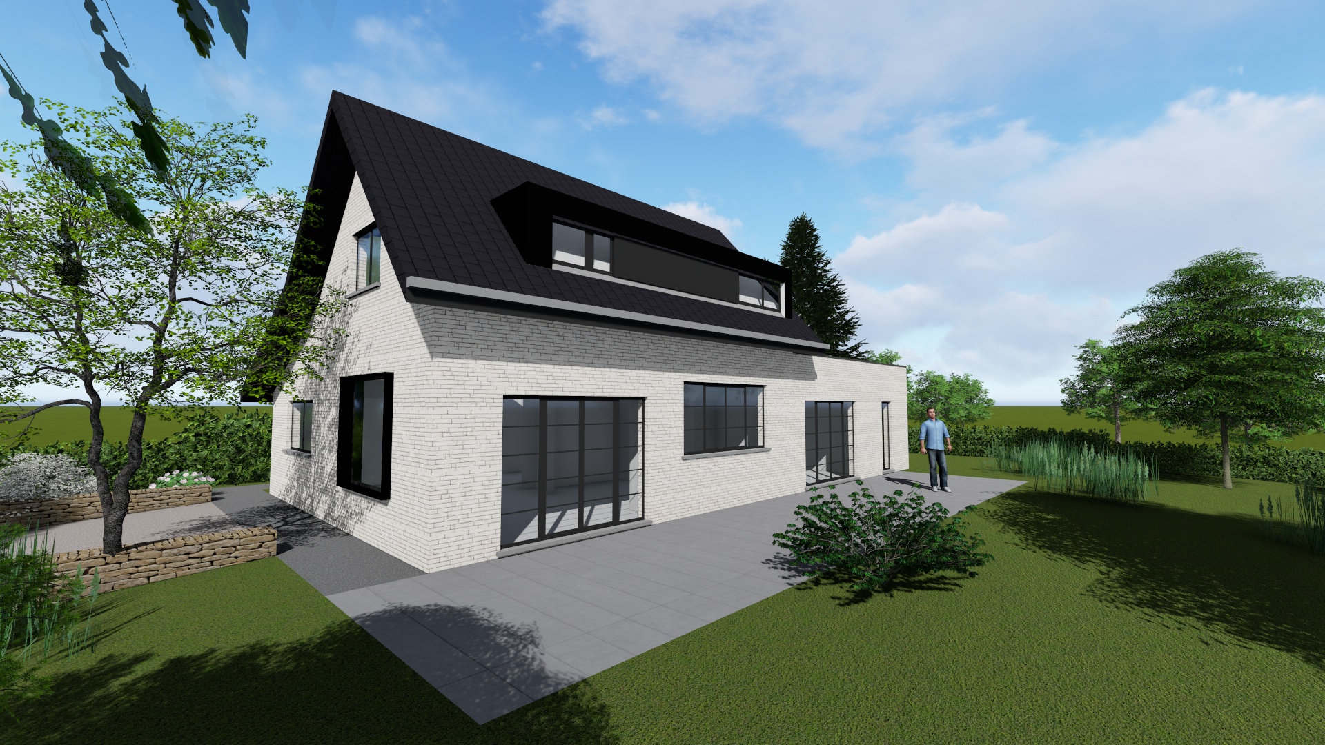 Le volume traité avec une toiture plate se développe à l’arrière du bâtiment dans le prolongement de celui-ci. Cette disposition permet d’identifier et de mettre en évidence le volume principal à versant. Le prolongement du versant existant soutient également cette idée et unifie l’habitation.